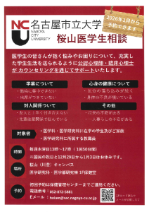 2025.12.19 桜山医学生相談室 開設のお知らせ 桜山医学生相談室 開設のお知らせ 2026年1月 開設 桜山医学生相談室では、医学生の皆さんが抱えるさまざまな悩みや不安について、桜山キャンパスにて個別に相談を受け付けます。 在学生の方は、お気軽にご相談ください。