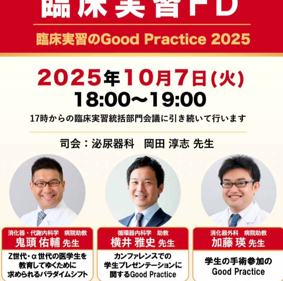 2025年10月7日、臨床実習FDが開催されました。学生から評価が高かった診療科に取り組みの工夫を共有していただきました。学生の評価が高いのも納得!!